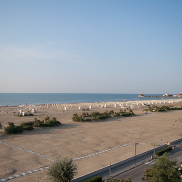 La plage privée est séparée de l'hôtel par une rue. Pour chaque chambre l'hôtel met à disposition un parasol et deux transats.